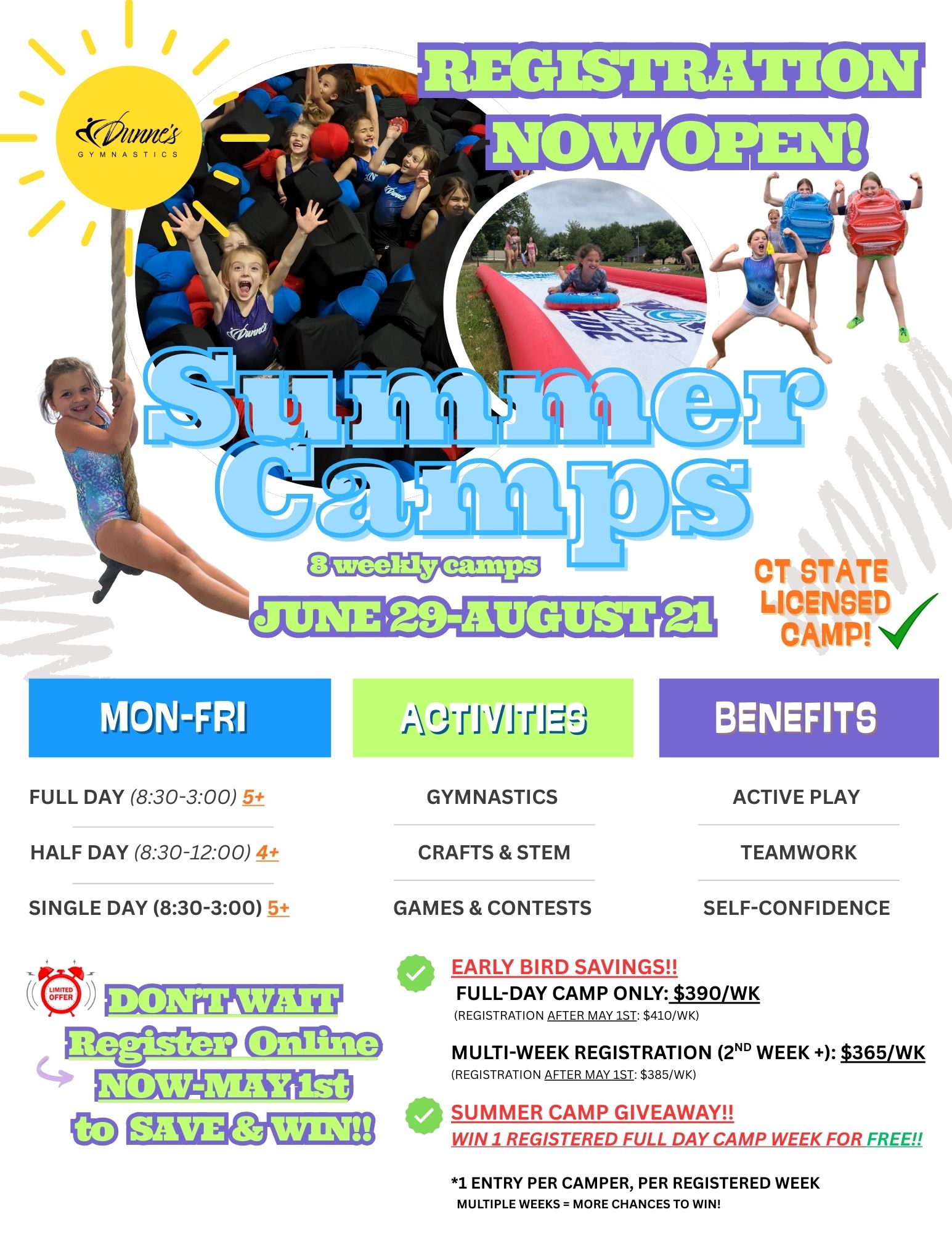 Learn MoreAction-packed days and summer memories that stick! Register by May 1st to SAVE $$ + WIN 1 Camp FREE! Perfect for Ages 4–12: No gymnastics experience needed! Spots are limited! Reserve your child today!