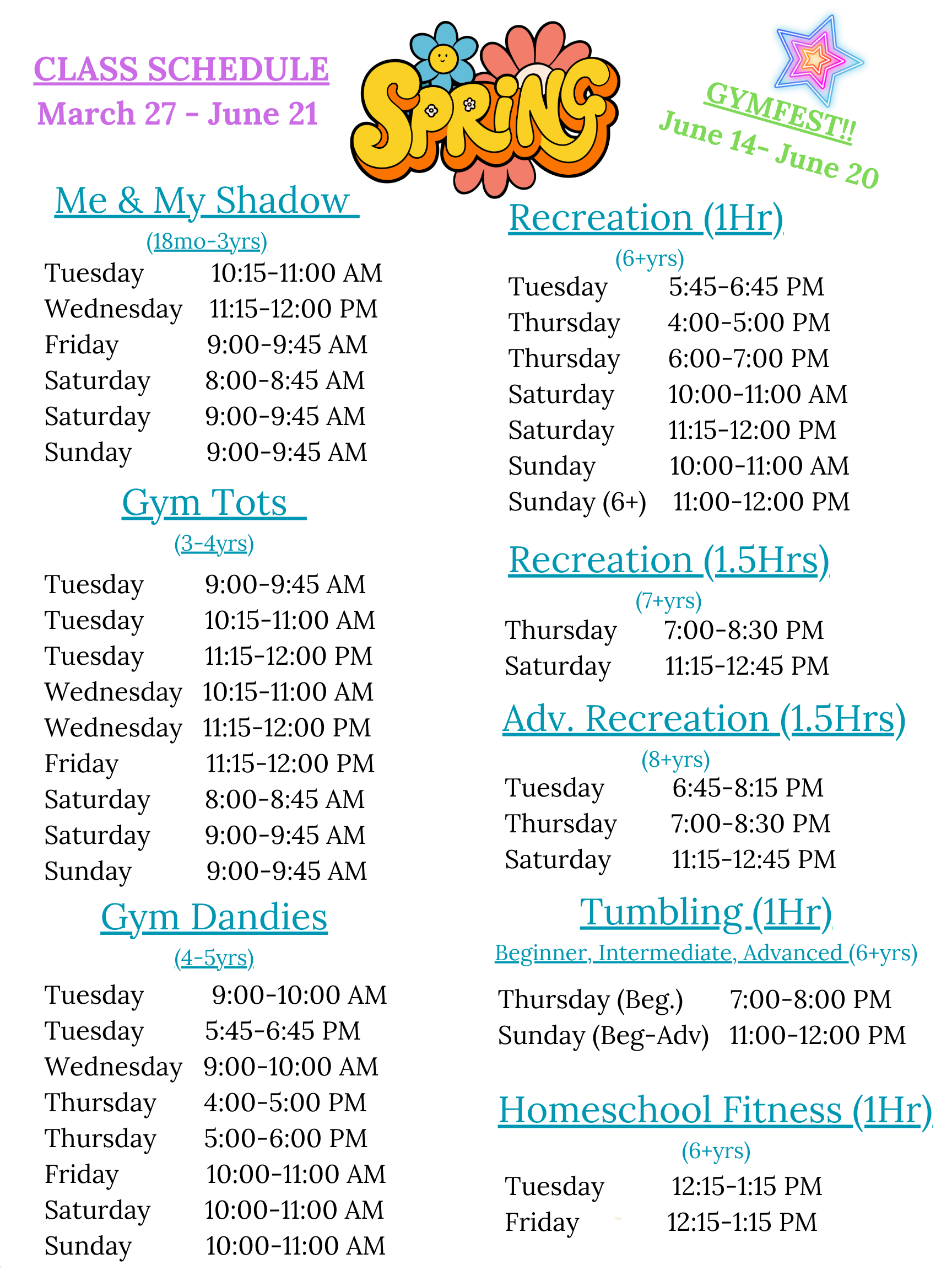 If you would like to switch classes (day or time) for the Spring Session, please contact our office as soon as possible by phone 860-228-1004 or info@dunnesgymnastics.com. We are happy to assist with internal class transfers based on availability.